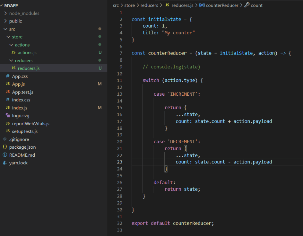 The reducer will return to the state with the same fields unmodified, except for the count field, which will be added to the value of the payload, depending on the action type ‘INCREMENT’ or ‘DECREMENT.’