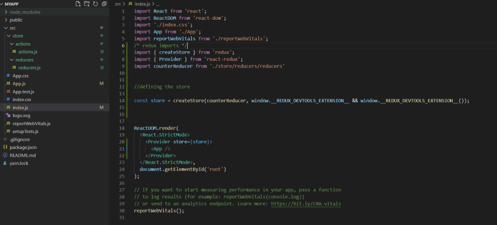 We need to create the store now that we have our actions and reducer ready. Do the following in the index.js file.