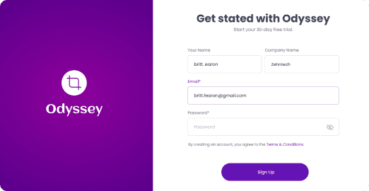 A tenant, in Odyssey, is a user who has subscribed to our solution and will be using it for their organization. Tenants can easily register on the tool by providing basic information, like company name, size, & the number of employees. Â