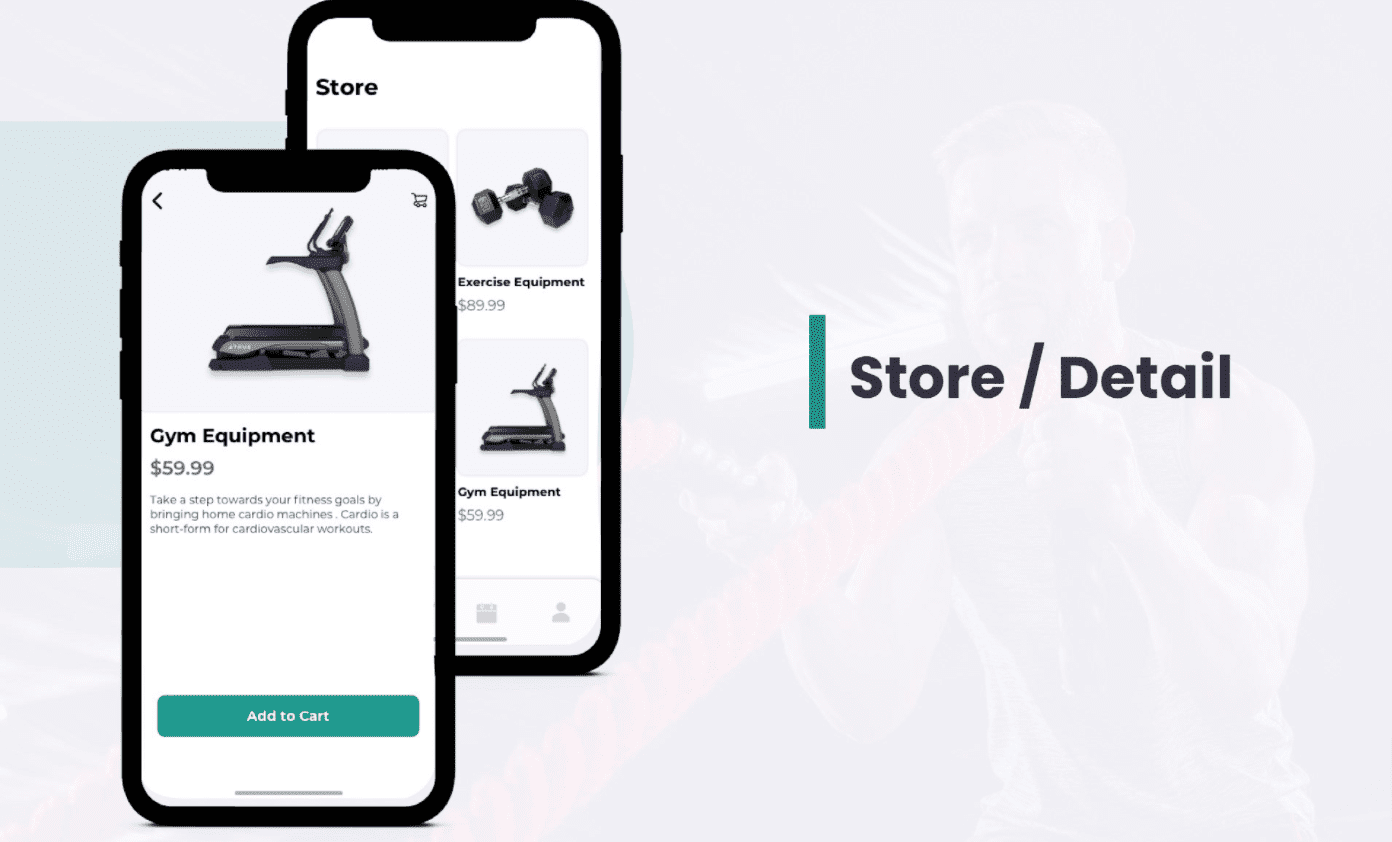 Cart Integration and Store Development: From the cart screen, users can access the online store from where they can buy the Gym types of equipment. The store screen shows all the gym equipment along with its price. When the users select any particular equipment, it leads them to the Add to cart screen -> Go to Cart -> My Cart. On the My Cart screen, user can see all the information such as the selected items, total amount, number of each item user is buying. There are 2 buttons (+ and -) available for users, which allows them to increase or decrease the number of each item they want to buy. On the same screen, payment buttons are available from where users can make the payment and purchase the equipment.