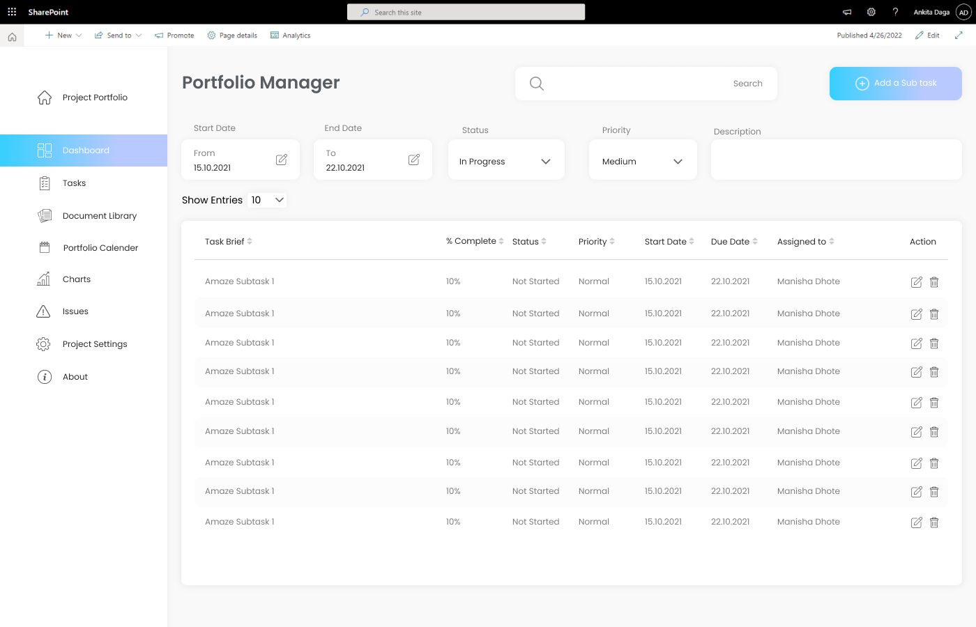 We modeled a custom web part that props up the creation & tracking of projects ensuring their timely successful delivery. The analysis displays the current level of projects and the deviations occurred till now alerting the people concerned to take all the necessary actions to ensure quality is delivered at pace. Though the project called for capricious updates, we tried to provide vindicate solution. The webpart was capable of: