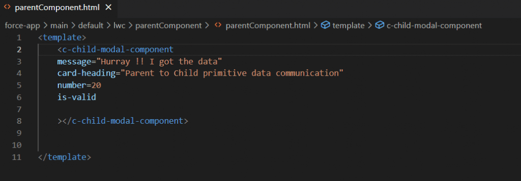In this example, we pass the name value from parent to child. Decorator @api informed lwc that the name is public property and can be used to communicate between parent and child.