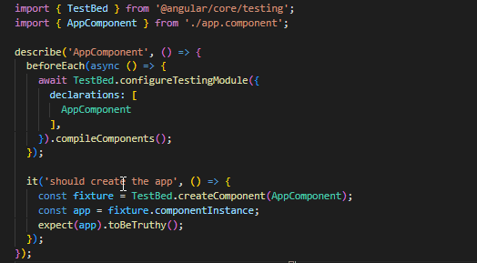 And you can start with writing simple test cases in Jasmine by following its official document here in the Angular CLI project. Below is an example of basic test case where “describe” denotes describing tests of component, “it” denotes test case and “expect” denotes as expectation and below that shows a code coverage report with statements, functions and lines covered by a test case.