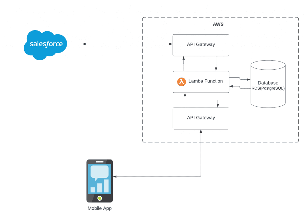 To overcome the above challenges with the Salesforce REST APIs, we decided to create a dedicated server with its database to work as a bridge between Salesforce and the Mobile app. We removed the direct connection between the Mobile app and Salesforce and bypassed this connection via AWS.