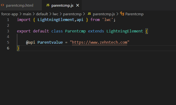 In this example, we create one decorator @api Parentvalue = “https://www.zehntech.com”